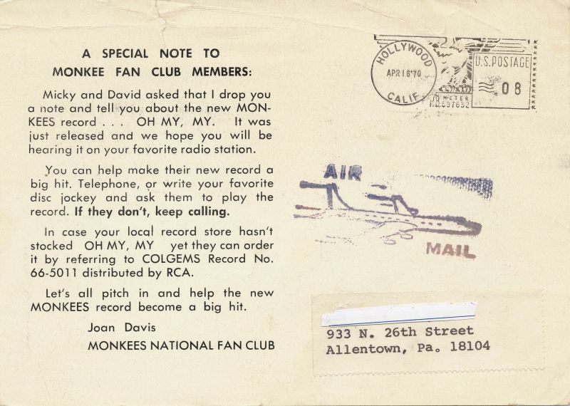 1970 Fan club Postcard